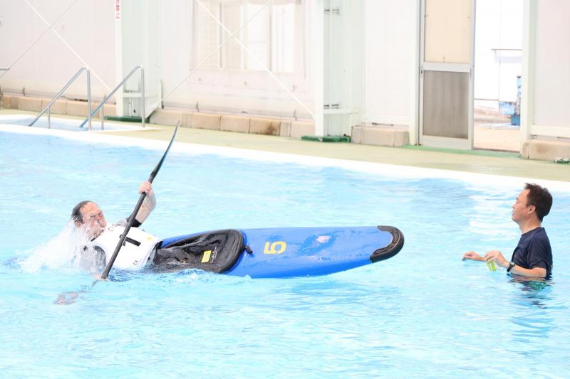 次の2枚の写真はロールという技の練習をしている様子です。ロールとは転覆した状態から起き上がることです。