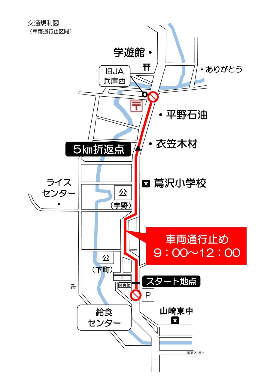 ロードレース大会開催に伴う交通規制について 投稿日時 : 11/13 管理 11月23日の午前中、ランナーの皆さまの安全確保のために大会会場付近となる県道岩野辺山崎線(429号)の一部で交通規制を行います。 規制時間内は車両通行止めになります。大変ご迷惑をおかけしますが、ご協力いただきますようお願いします。 <規制時間> 令和7年11月23日(日)9時00分から12時00分まで <規制区間> 県道岩野辺山崎線(429号)(山崎スポーツセンターから旧JA兵庫西蔦沢支店まで) 交通規制図.pdf Tweet {{options.likeCount}} {{options.likeCount}} {{options.unlikeCount}} {{options.unlikeCount}} 0 コメント